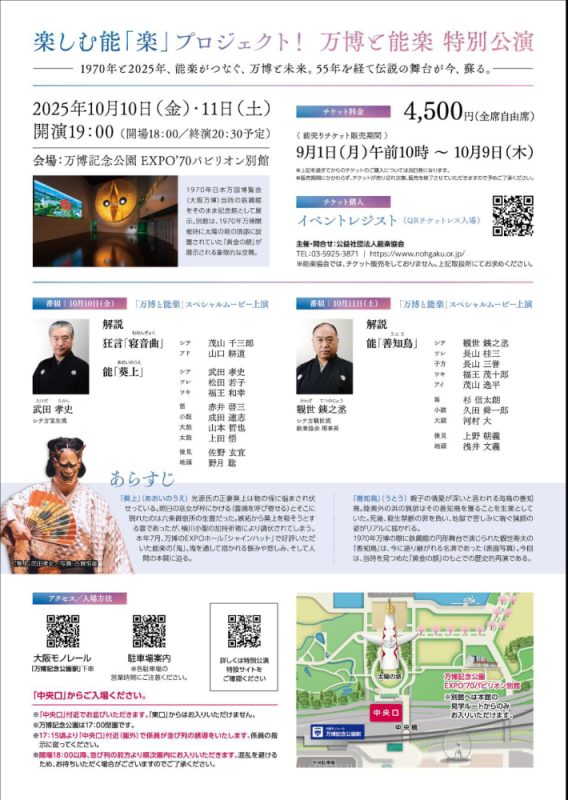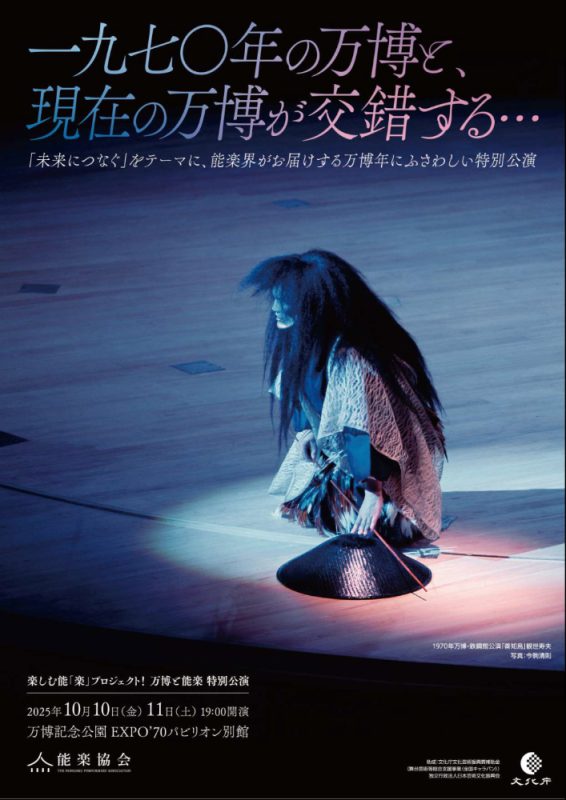 2025.9.25 楽しむ能「楽」プロジェクト! 万博と能楽 特別公演 (一日目)2025年10月10日(金)19時開演 万博記念公園 EXPO’70 パビリオン別館(二日目)2025年10月11日(土)19時開演 万博記念公園 EXPO’70 パビリオン別館主催による公式ページはこちら(一日目・二日目)
